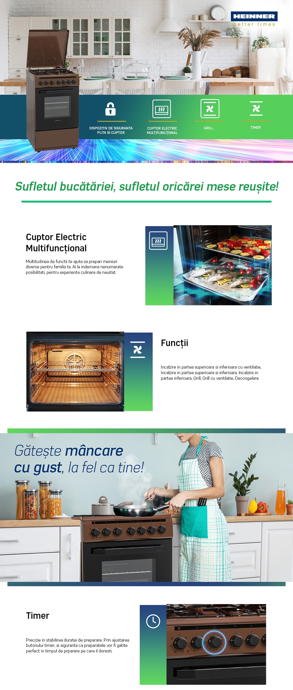 Aragaz Mixt Heinner HFSC-V60LITGC-BRW, 50x60cm, 4 arzatoare, Suport email, Capac metalic, Aprindere electrica plita, Dispozitiv de siguranta plita, Cuptor electric, 6 functii, Timer, Grill, Ventilatie, Decongelare, Lumina cuptor, Usa cuptor cu geam dublu detasabil, Duze GPL incluse, Tava si gratar cromat, Dimensiuni ( LxAxI): 50x60x85 cm, Culoare: Maro