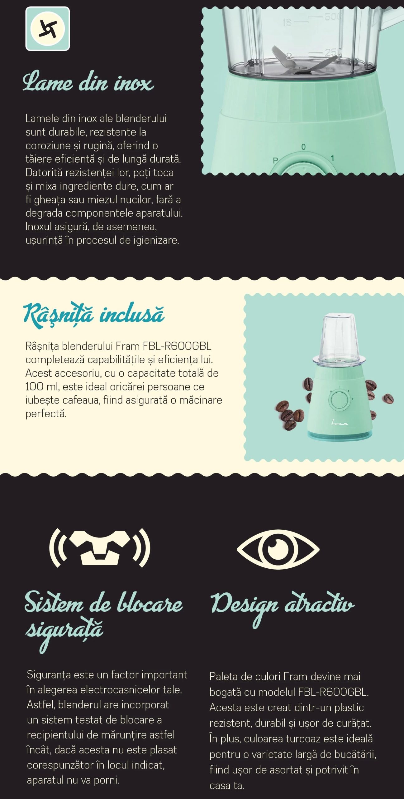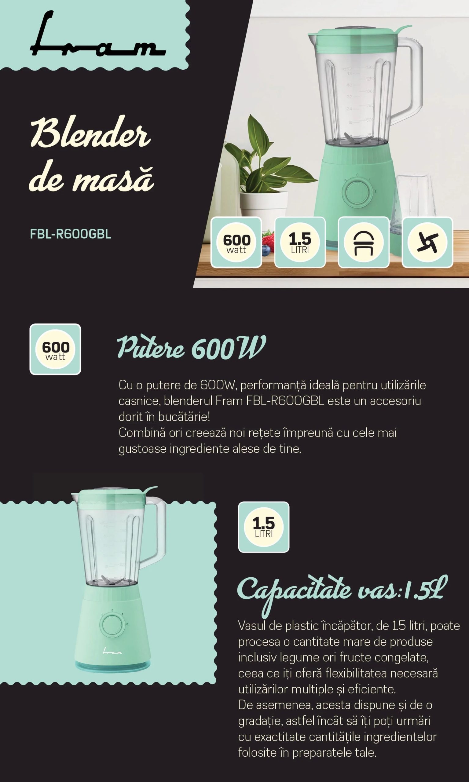Blender de masa Fram FBL-R600GBL, 600W, rasnita inclusa, capacitate cana: 1.5L, 2 viteze + pulse, lame inox, sistem siguranta, protectie supraincalzire, turcoaz