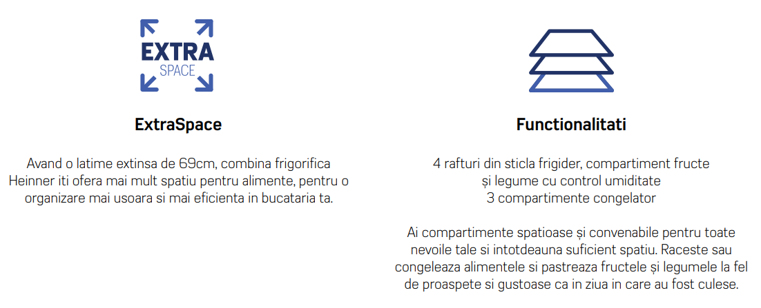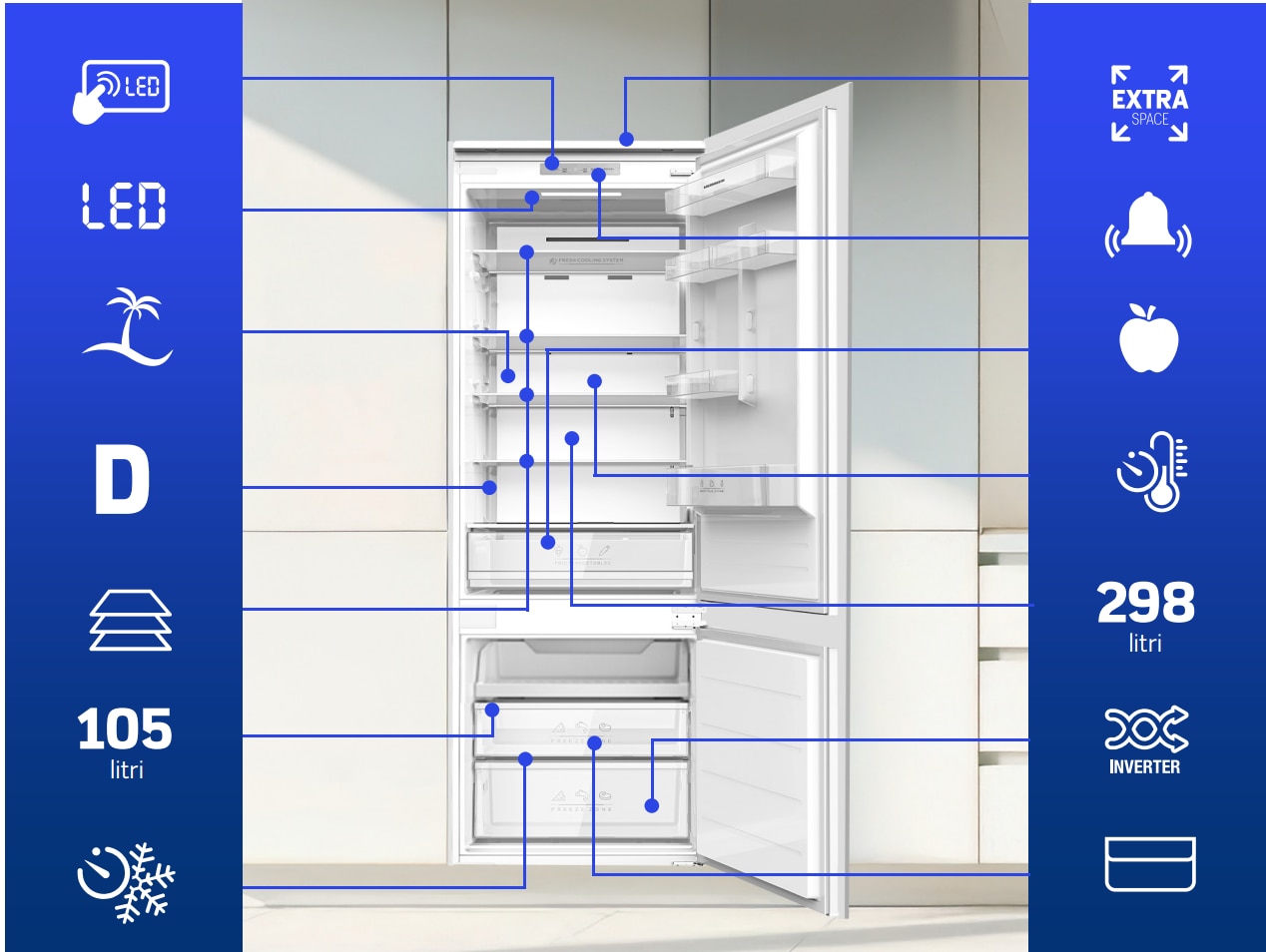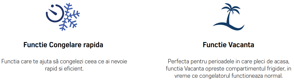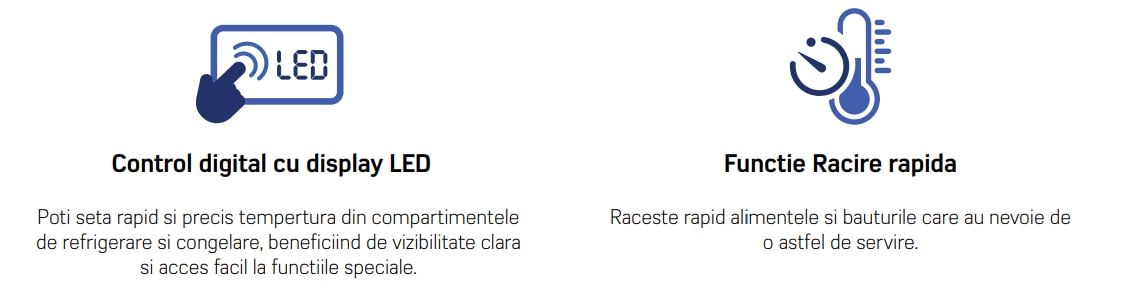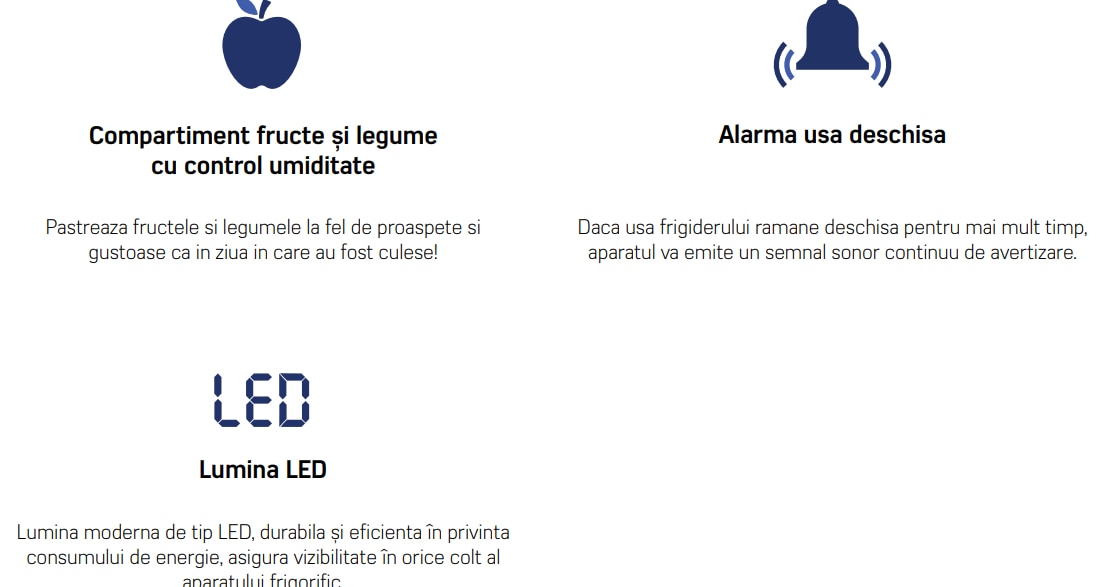Functii Holiday Super congelare Super Cooling Alarma acustica deschisa la usa Compartiment pentru fructe si legume cu control umiditate