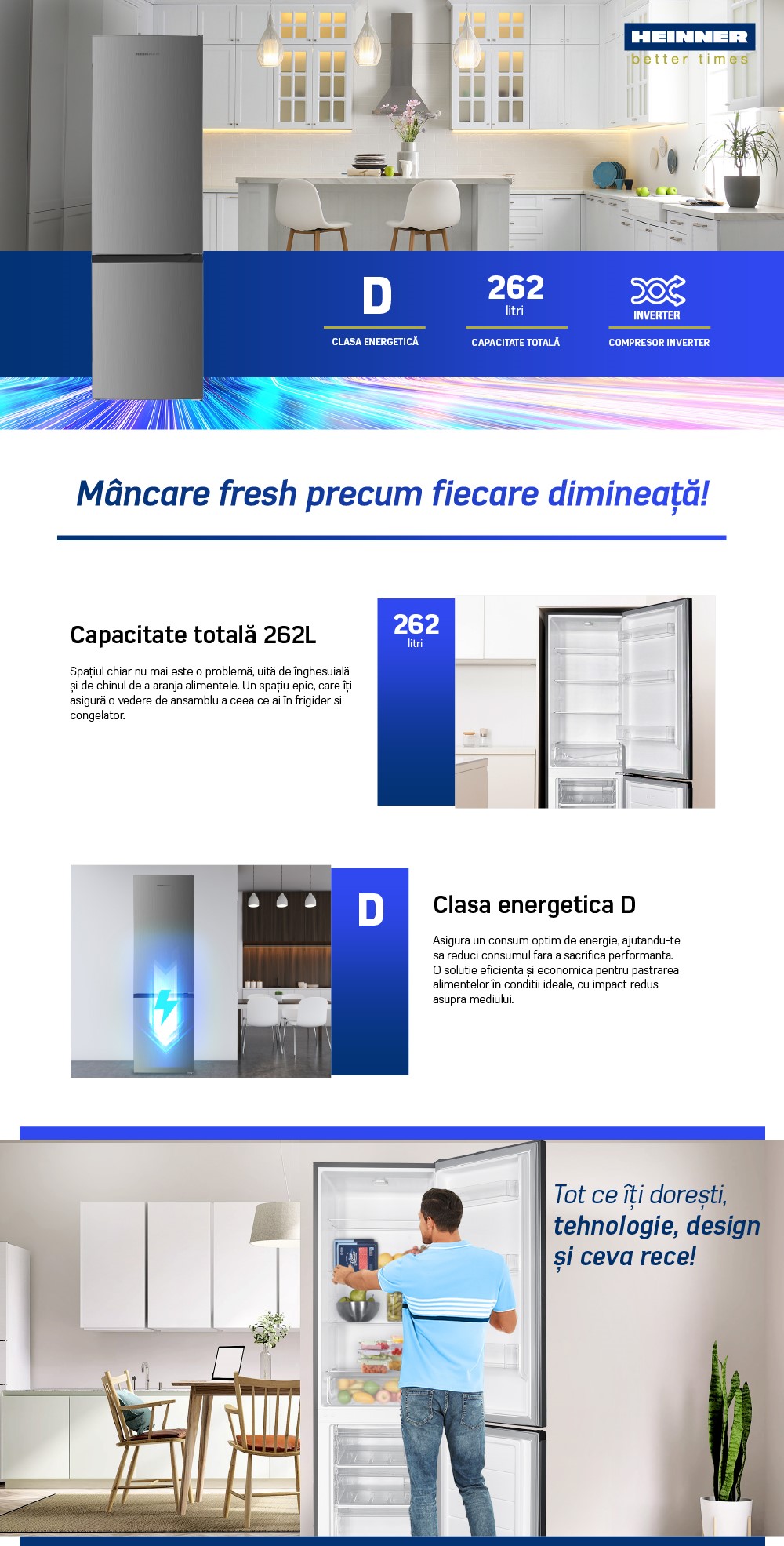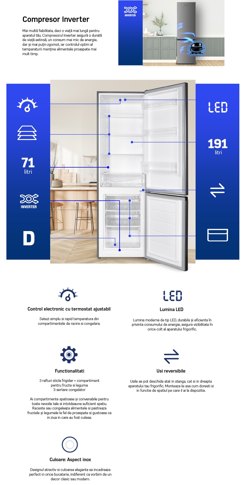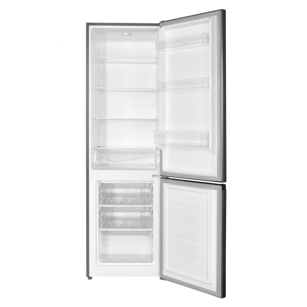 Combina frigorifica Heinner HC-HM262INVXD, clasa energetica: D, compresor Inverter, capacitate totala: 262L, capacitate frigider: 191L, capacitate congelator: 71L, control electronic cu termostat ajustabil, lumina LED, 3 rafturi sticla frigider, compartiment pentru fructe si legume, 3 sertare congelator, usi reversibile, suport oua, tavita cuburi de gheata, capacitate congelare: 3.2kg/24h, dimensiuni (WxDxH): 55 x 56 x 180 cm, culoare: Aspect inox