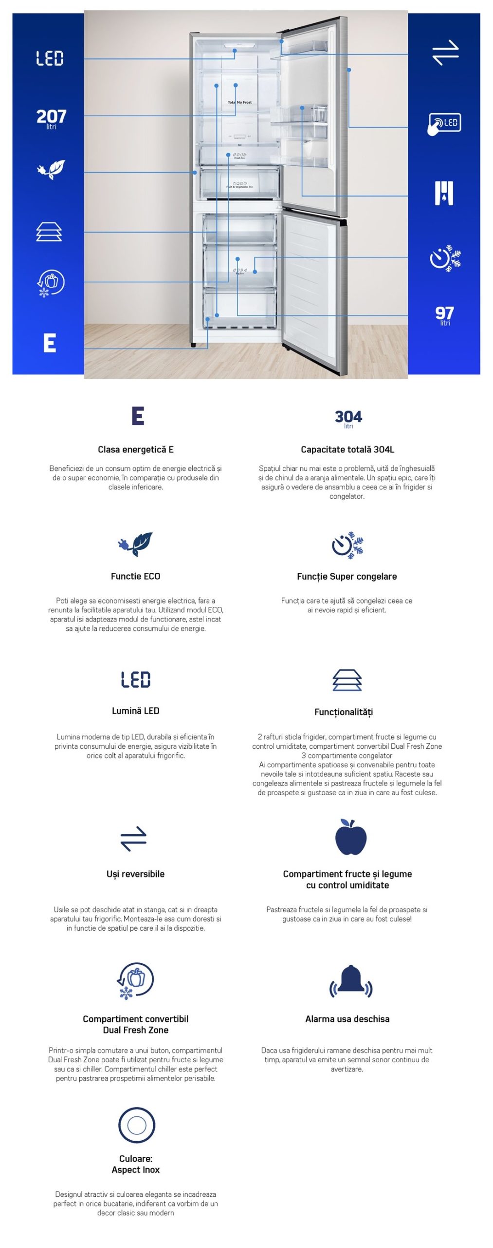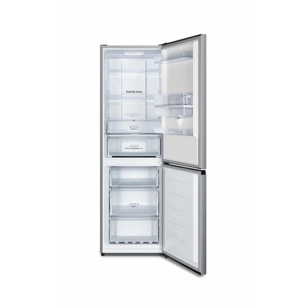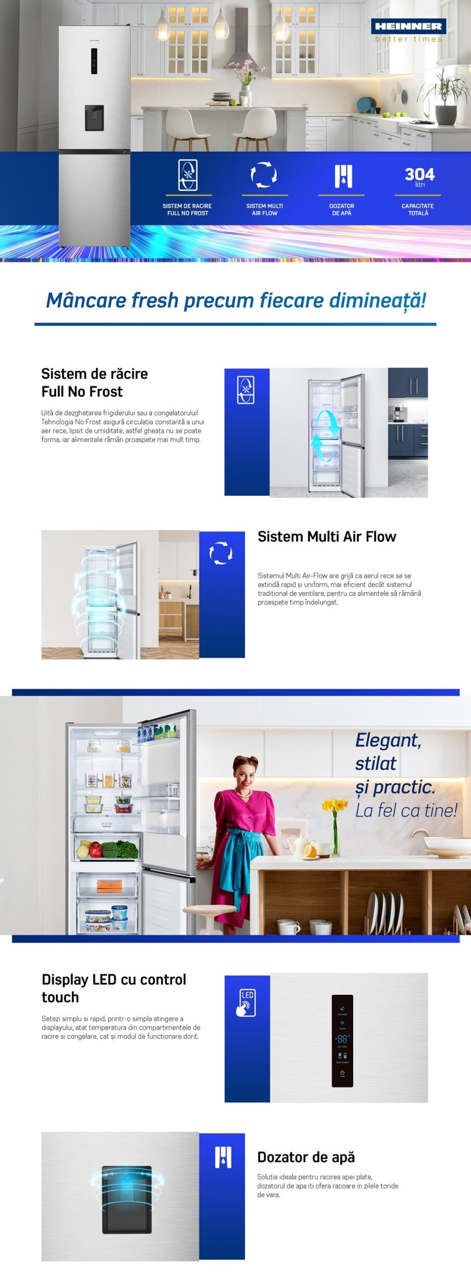 Combina frigorifica Heinner HCNF-HS304XWDE++, Full No Frost, sistem Multi Air-Flow, dozator de apa, clasa energetica: E, capacitate totala: 304 L, capacitate frigider: 207 L, capacitate congelator: 97 L, control electronic cu display LED si control touch, functie ECO, functie Super congelare, compartiment convertibil Dual Fresh Zone, lumina LED, 3 rafturi din sticla frigider, compartiment pentru fructe si legume, 3 compartimente congelator, capacitate de congelare: 6kg/24h, dimensiuni (WxDxH): 59.5 x 59 x 186 cm, culoare: Aspect Inox