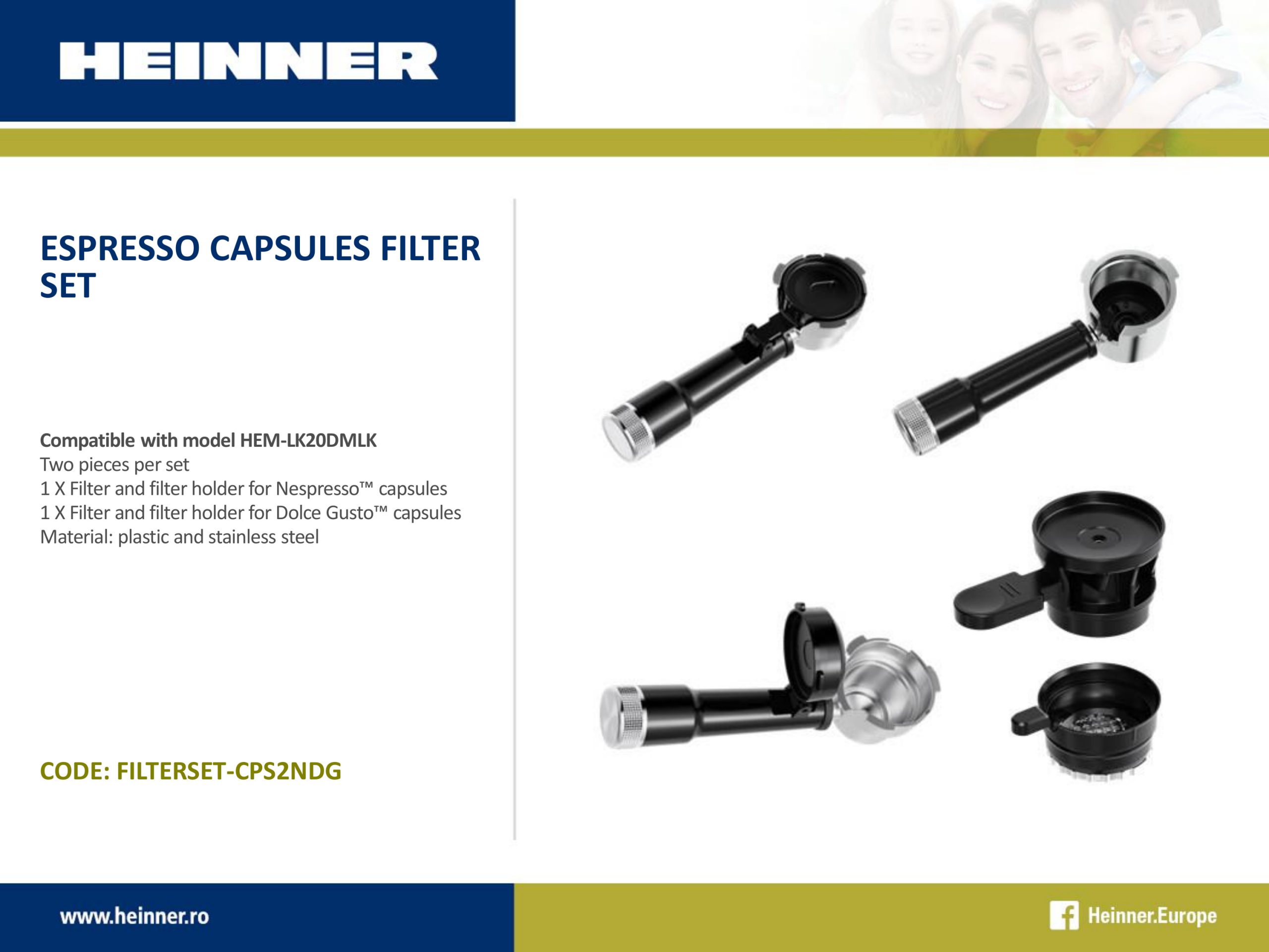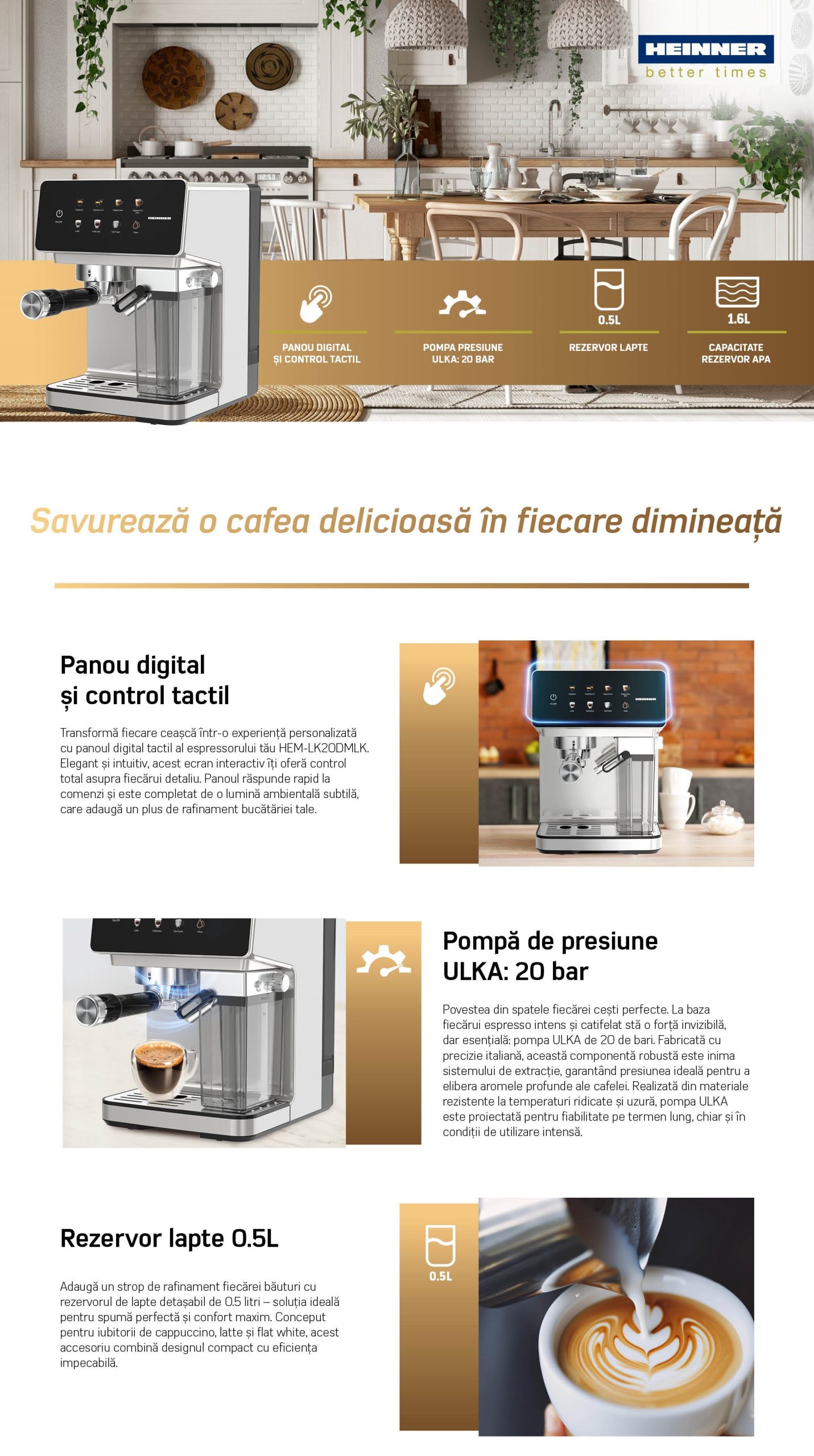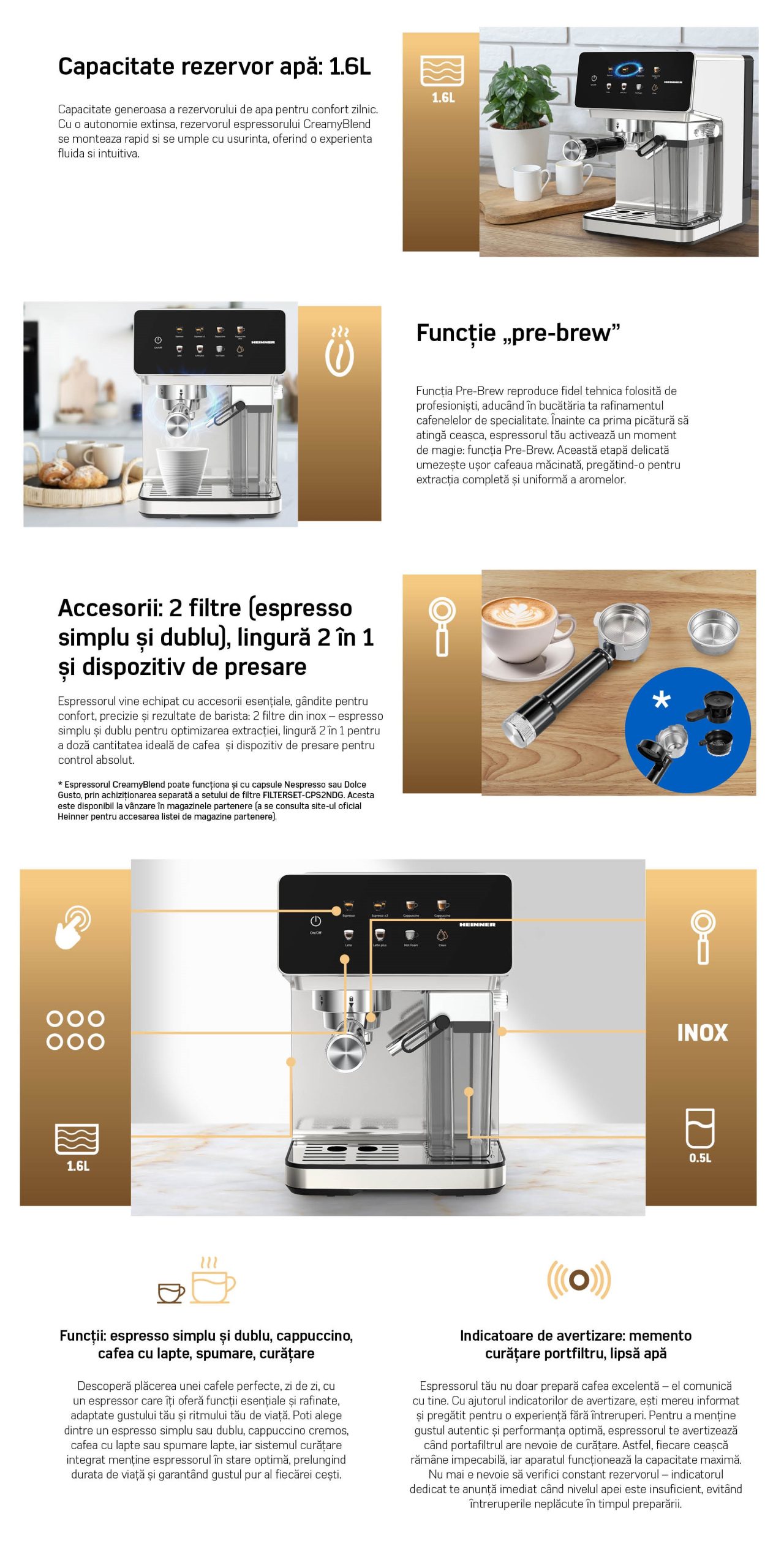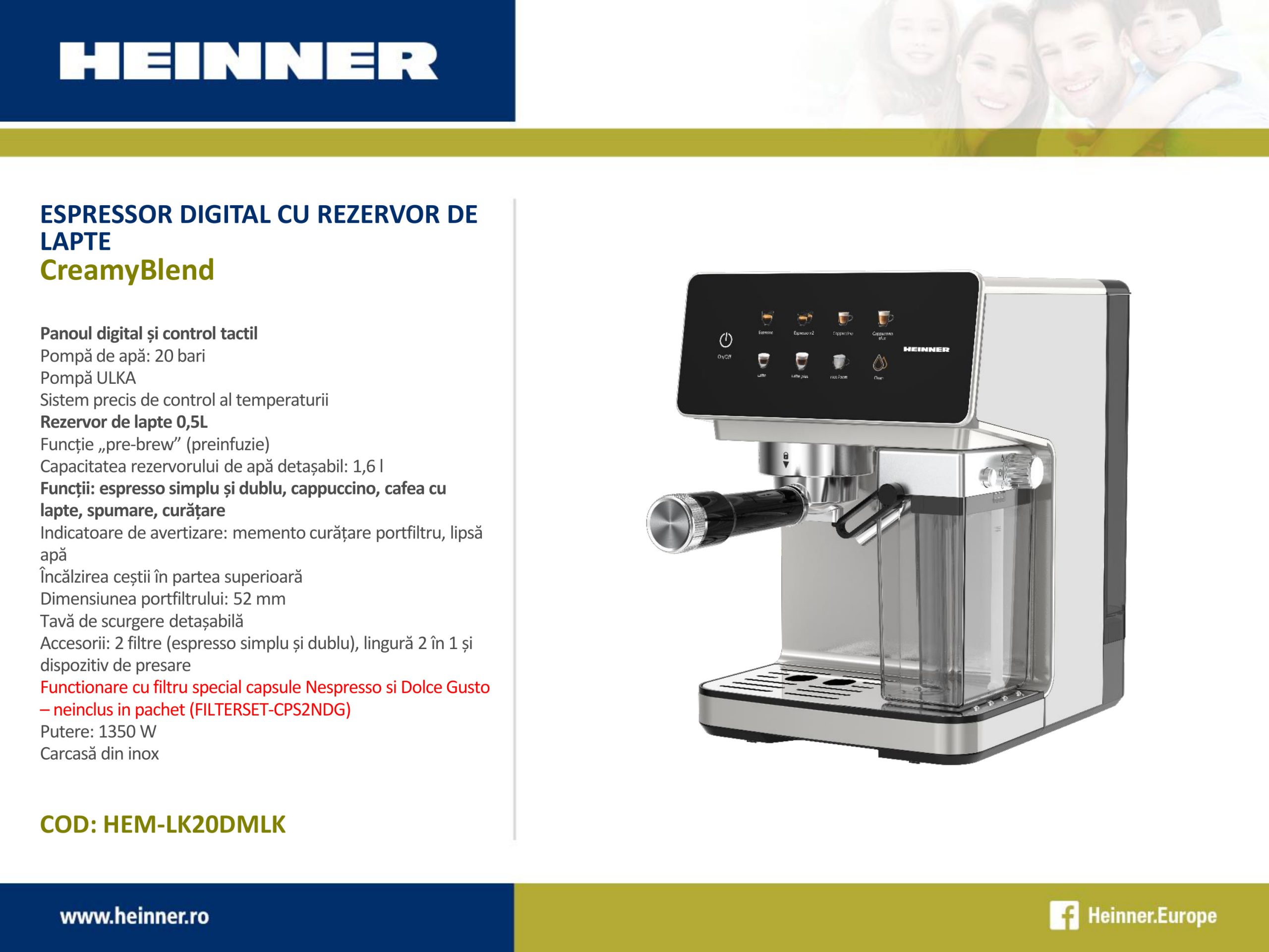 Espressor digital cu rezervor lapte Heinner CreamyBlend HEM-LK20DMLK, 1350W, 20 bar, capacitate rezervor apa detasabil 1.6L, rezervor lapte detasabil 0.5L, panoul digital si control tactil, Inox + SET DE FILTRE PENTRU CAPSULE DE ESPRESSOR HEINNER FILTERSET-CPS2NDG
