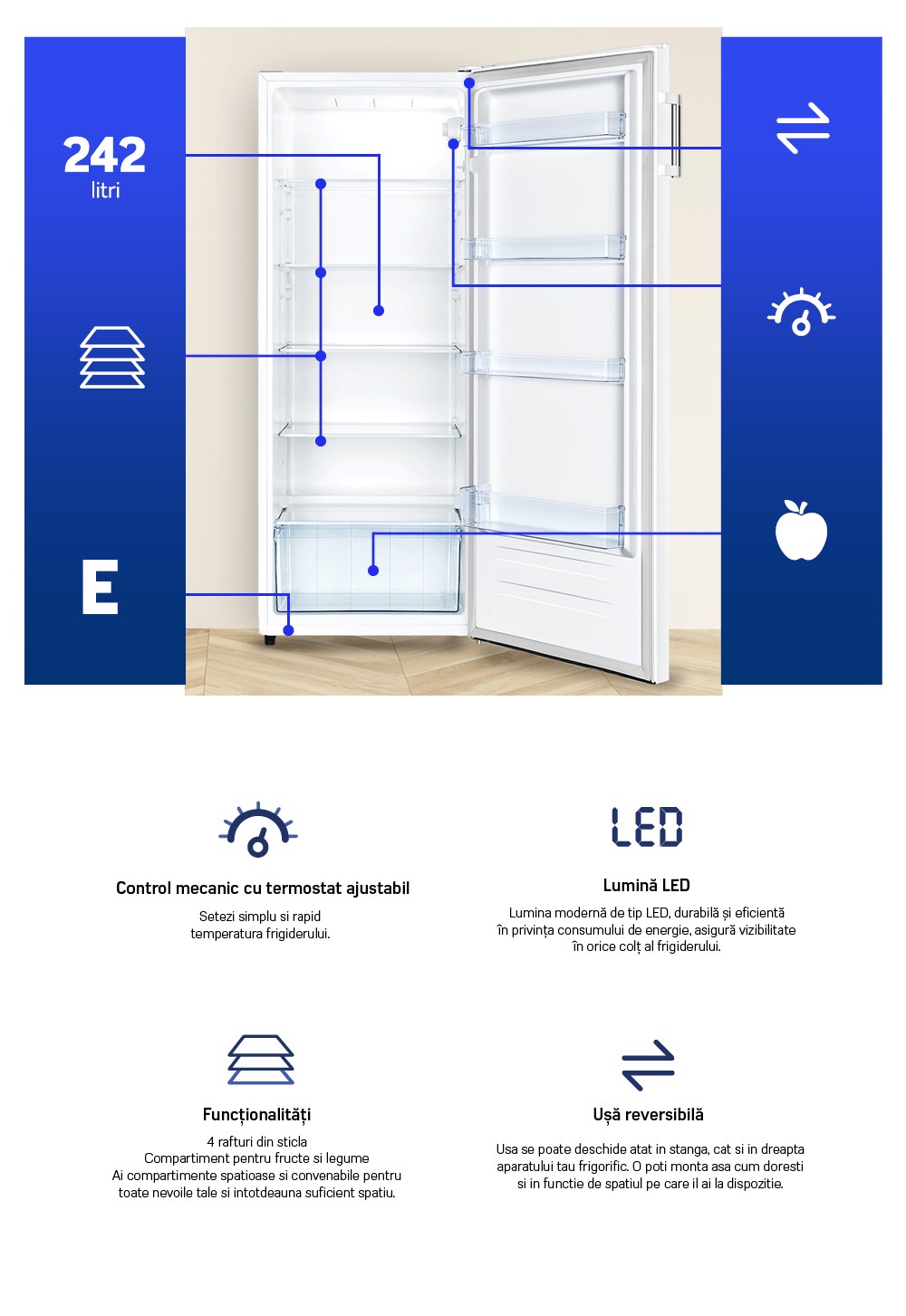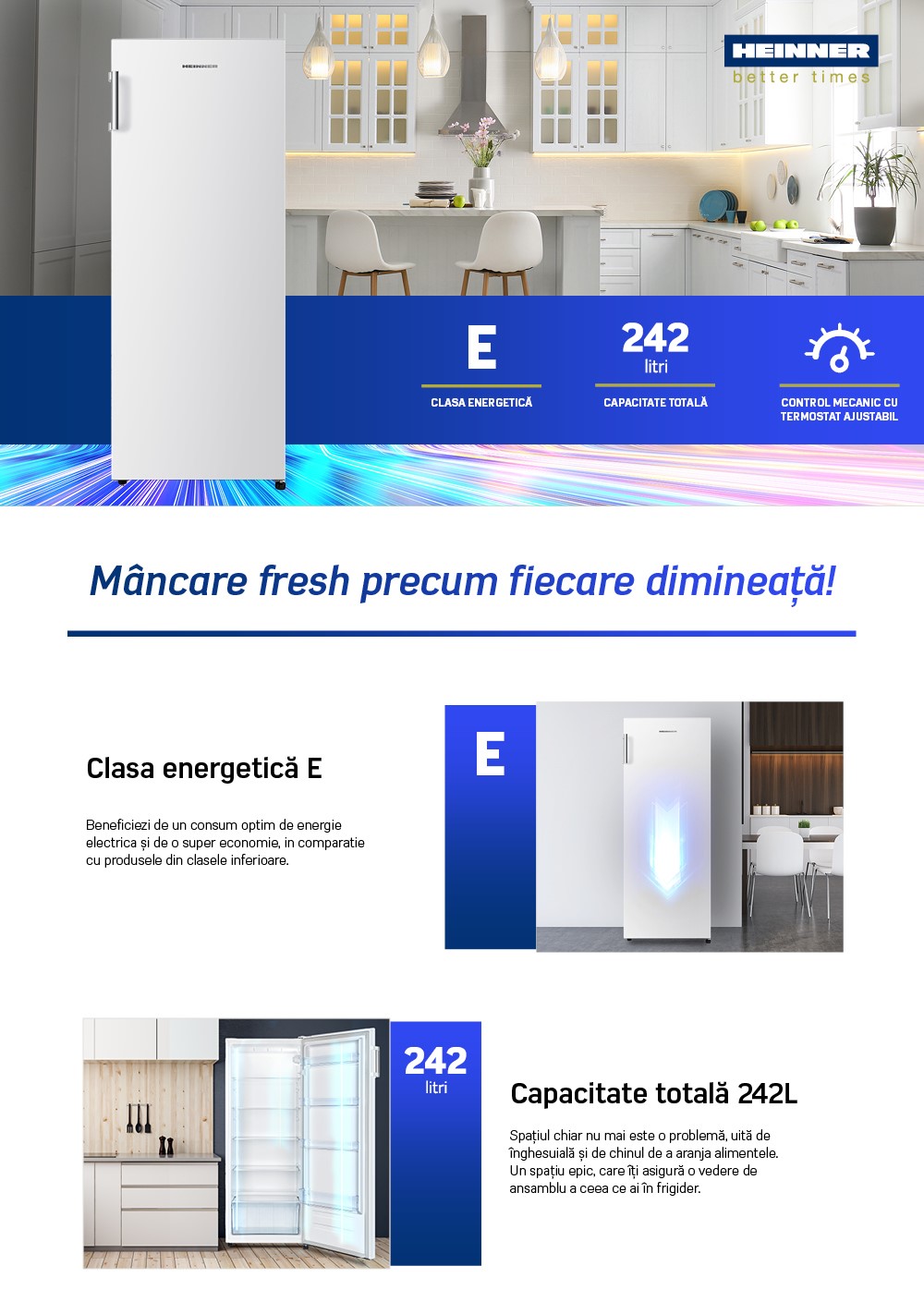 Frigider Heinner HF-HS250E++, clasa energetica: E, capacitate totala: 242L, control mecanic cu termostat ajustabil, lumina LED, 4 rafturi sticla frigider, compartiment pentru fructe si legume, usa reversibila, suport oua, dimensiuni (WxDxH): 55 x 58.8 × 143.4 cm, culoare: Alb