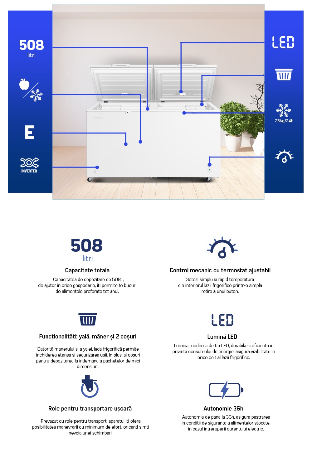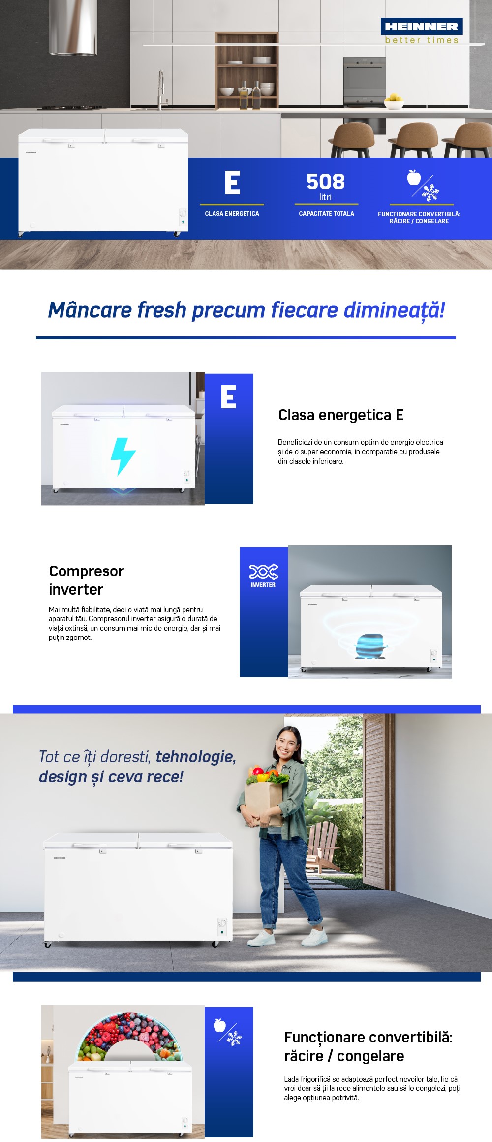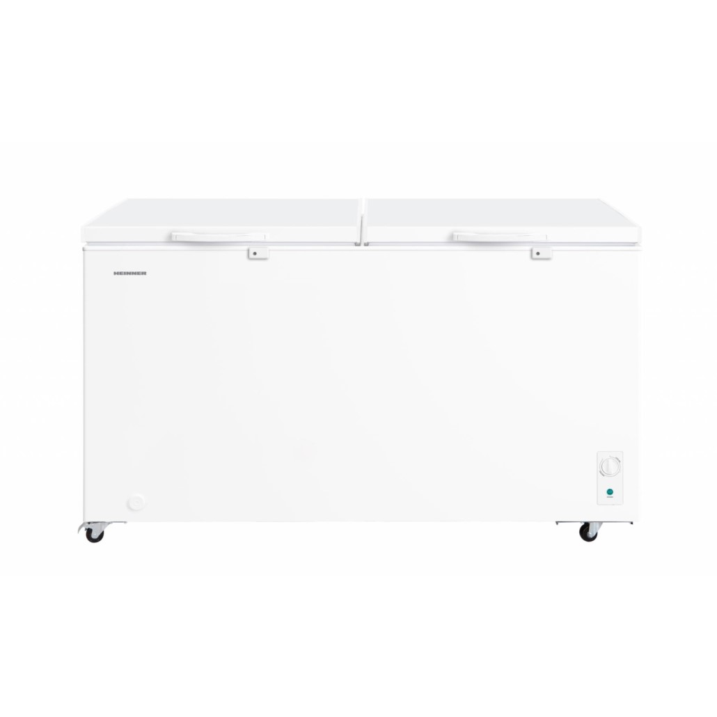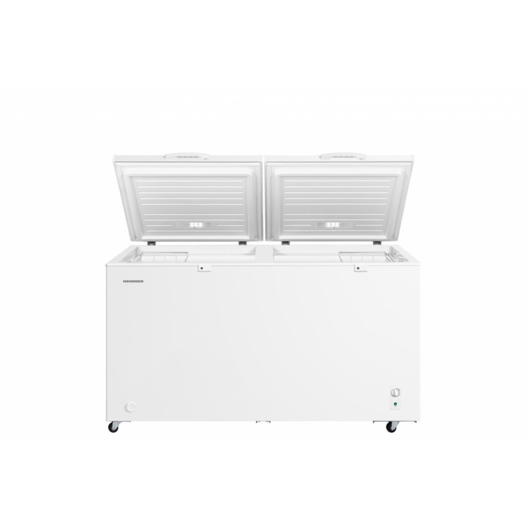 Lada frigorifica Heinner HCF-M508INVCE++, clasa energetica: E, compresor Inverter, functionare convertibila (Frigider/Congelator), capacitate totala: 508L, control mecanic, rezistenta la frig, lumina LED, 2 cosuri, maner extern cu incuietoare, decongelare manuala, role pentru transportare usoara, capacitate de congelare: 23kg/24h, dimensiuni (LxAxI): 153 x 73.5 x 86 cm, culoare: Alb