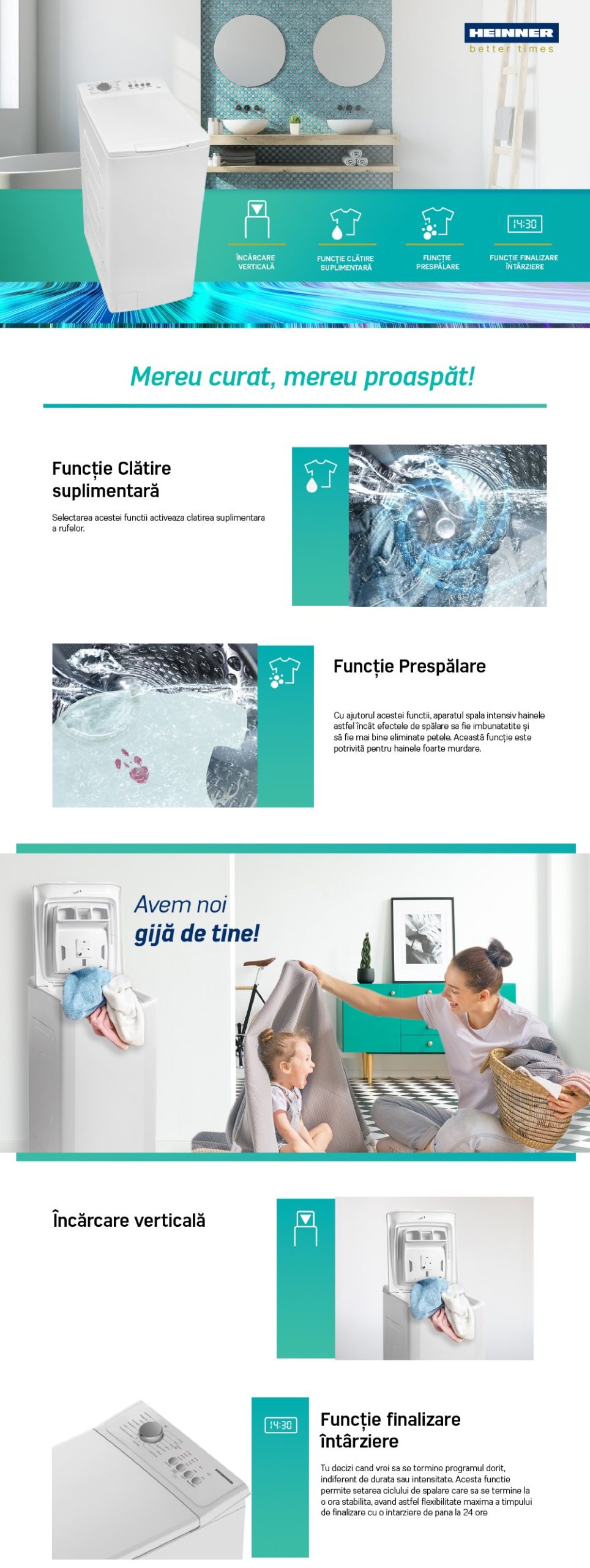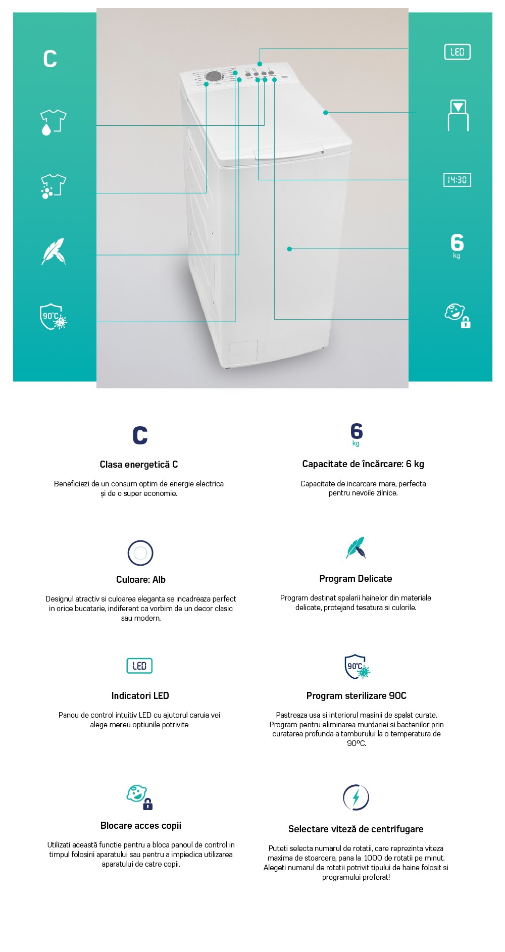 MASINA DE SPALAT RUFE CU INCARCARE VERTICALA HEINNER HWM-TL6010C++, CAPACITATE 6KG, VITEZA DE CENTRIFUGARE 1000RPM, CLASA ENERGETICA C, 15 PROGRAME, DISPLAY LED, PROGRAM RAPID 15MIN, PROGRAM SCURT 45MIN, PROGRAM HYGIENE 90°C, PROGRAM DELICATE, CLATIRE SUPLIMENTARA, PRESPALARE, FUNCTIE INTARZIERE FINALIZARE, SELECTOR VITEZA DE CENTRIFUGARE, BLOCARE ACCES COPII, DIMENSIUNI ( LXAXI): 40X61X87.5 CM, CULOARE ALB