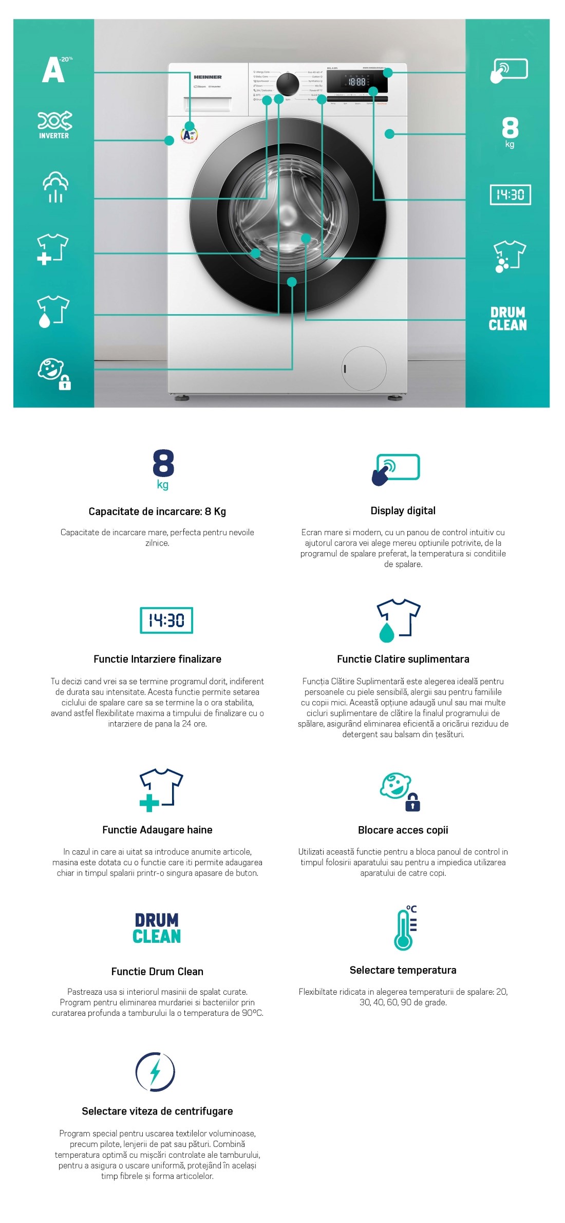 Functii Clatire suplimentara Prespalare Selector viteza centrifugare Selector temperatura de spalare Intarziere finalizare Adaugare haine Add On Eliminare semnale acustice Igienizare cuva