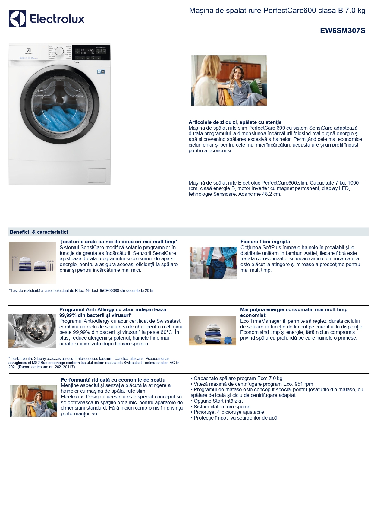 Masina de spalat rufe Slim Electrolux EW6SM307S, 7 kg, 1000 RPM, Clasa B, PerfectCare600, Motor Inverter cu MagnetPermanent, Display LED, SensiCare, TimeManager, Alb