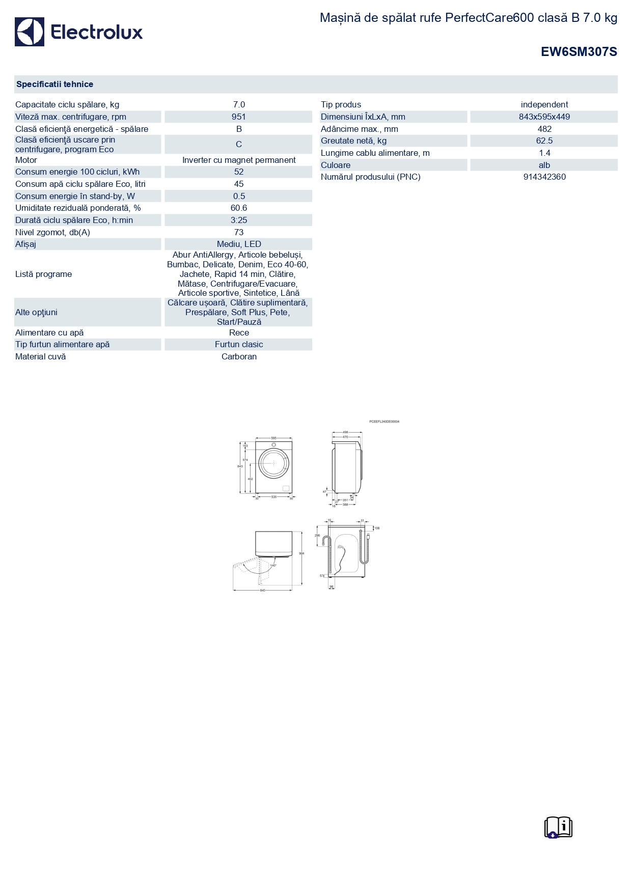 Masina de spalat rufe Slim Electrolux EW6SM307S, 7 kg, 1000 RPM, Clasa B, PerfectCare600, Motor Inverter cu MagnetPermanent, Display LED, SensiCare, TimeManager, Alb