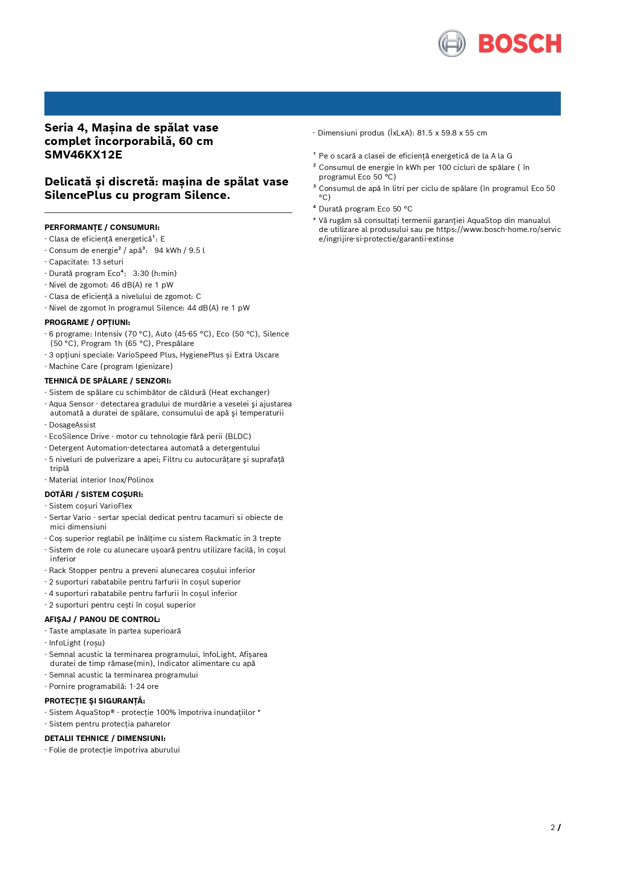 Masina de spalat vase incorporabila Bosch SMV46KX12E, 13 seturi, 6 programe, InfoLight, ExtraDry, EcoSilence Drive, Clasa E, 60 cm
