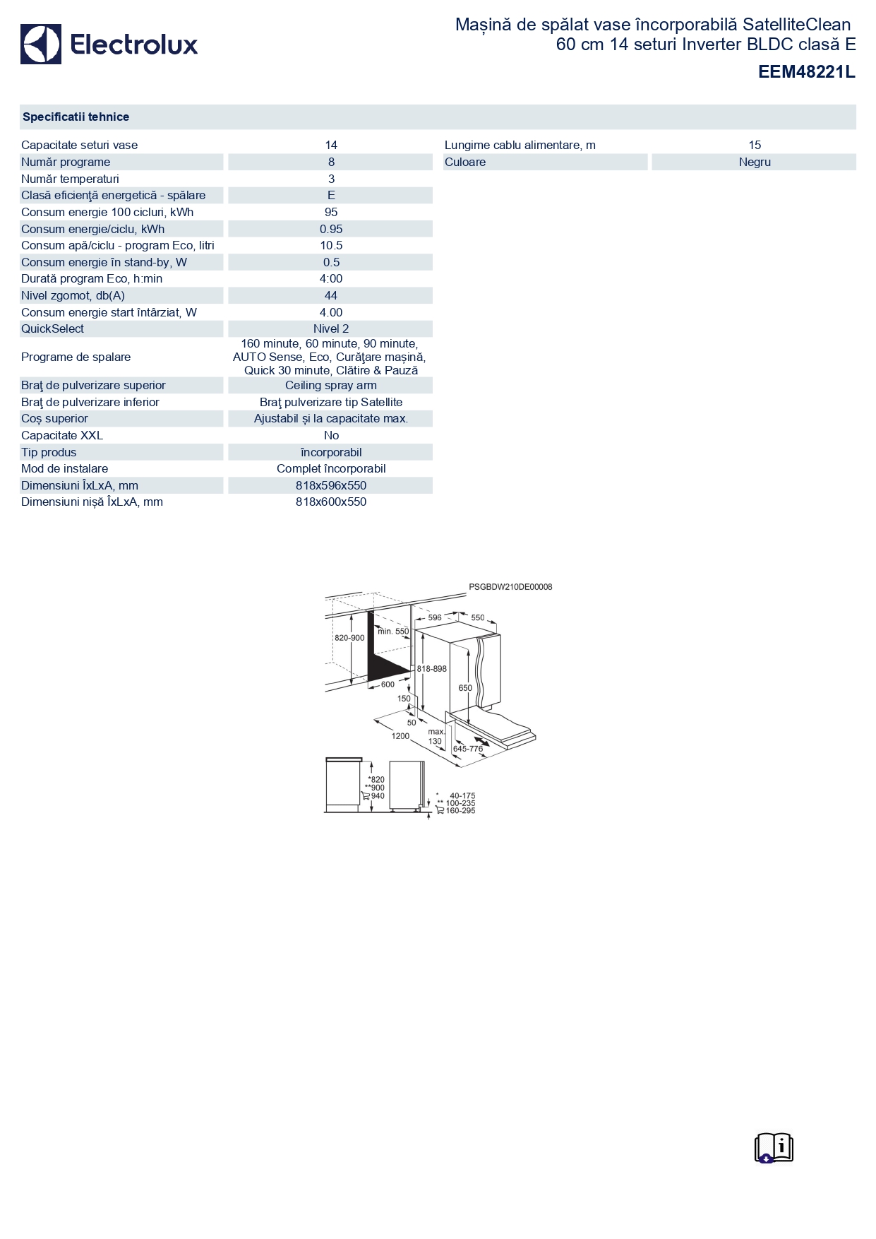 Masina de spalat vase incorporabila Electrolux EEM48221L, 14 seturi, 8 programe, Clasa E, Motor Inverter, TimeBeam, QuickSelect, SatelliteClean, AirDry, MaxiFlex, 60 cm