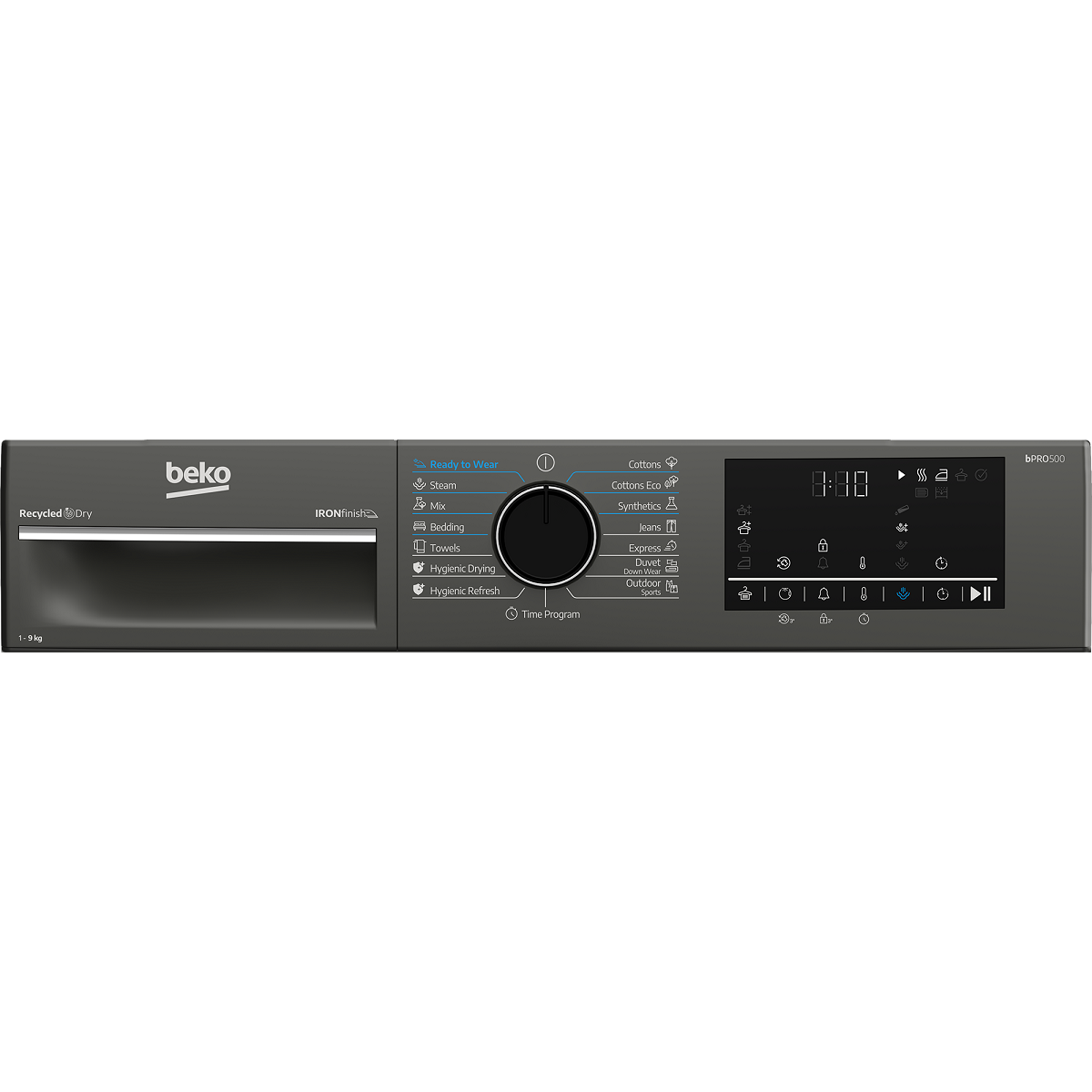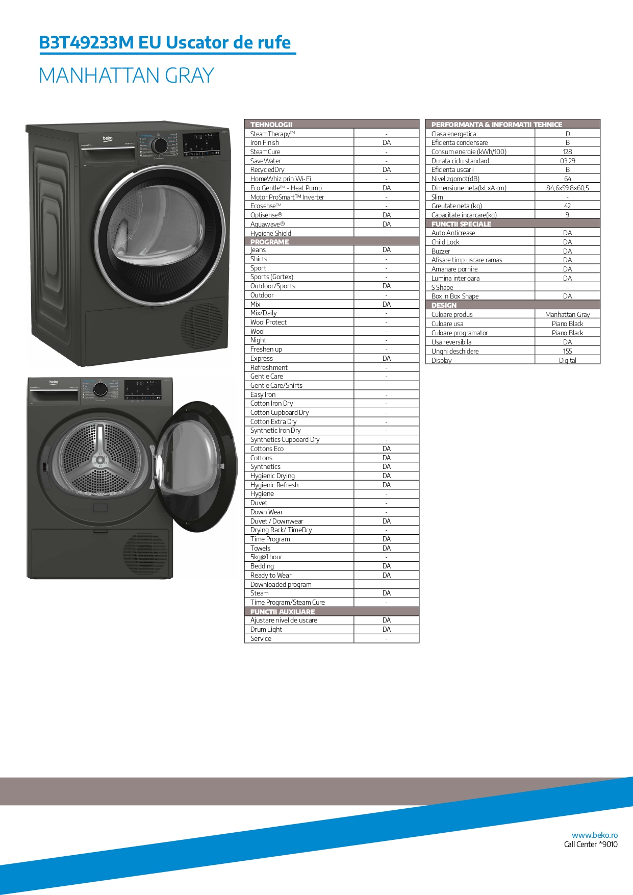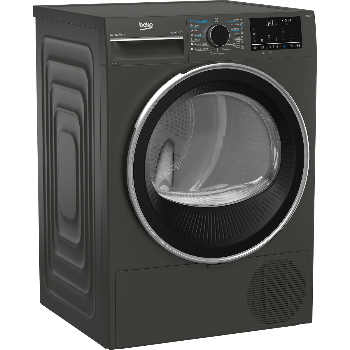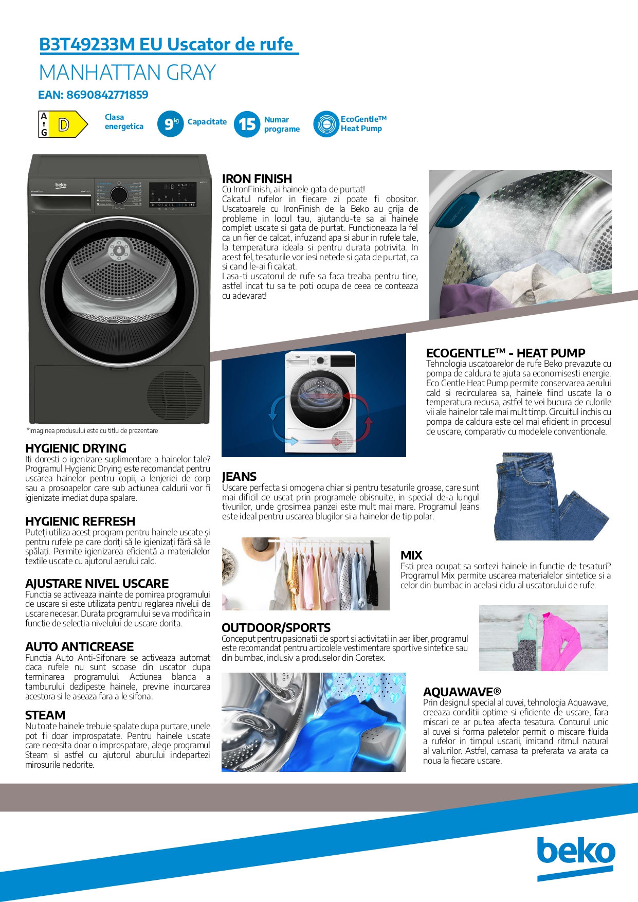 Uscator de rufe Beko B3T49233MEU Pompa de caldura, 9 kg, 15 programe, Clasa D, Iron Finish, RecycledDry, OptiSense, Aquawave, Hygienic Refresh, Antracit
